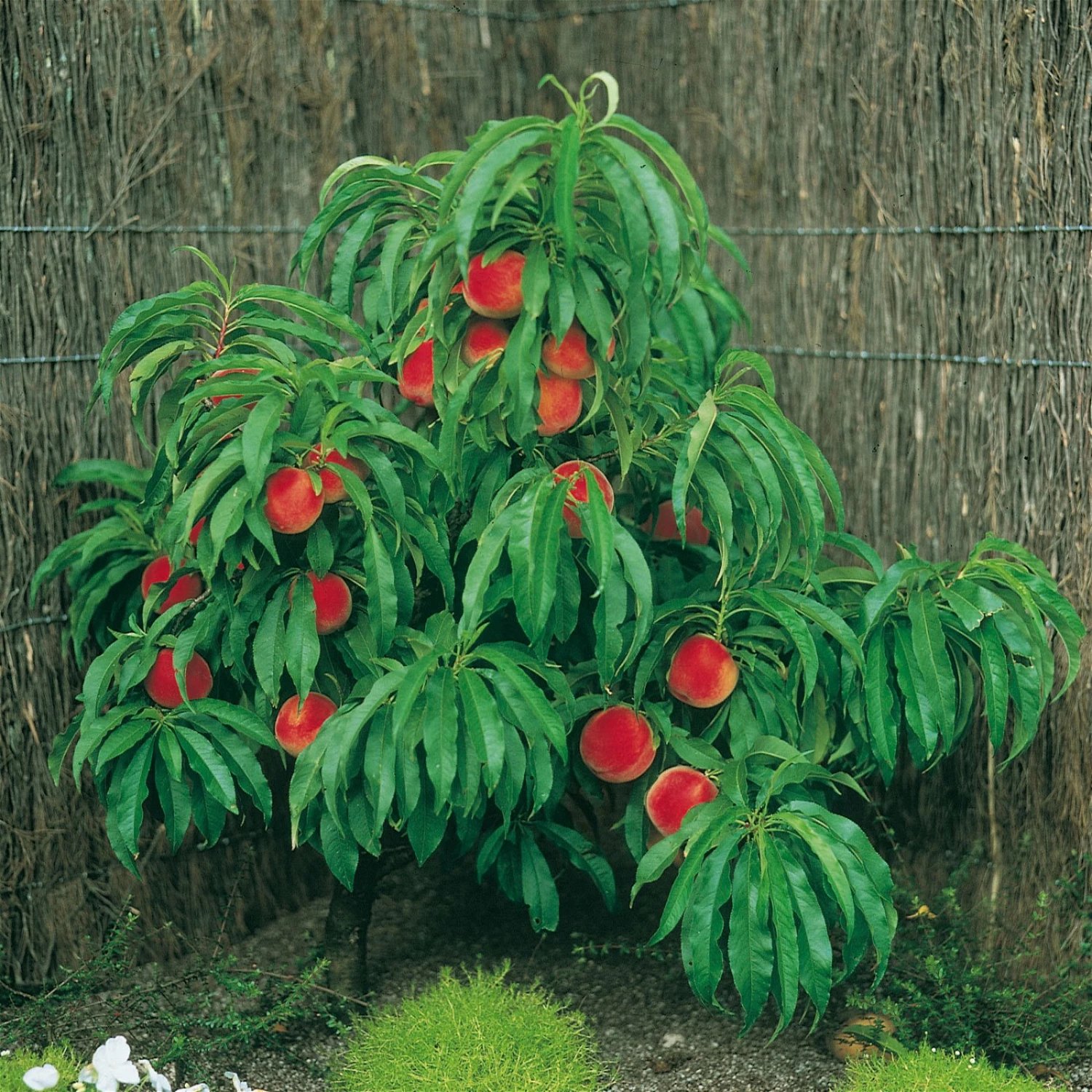 Mit dem Zwergpfirsich ‚Amber’® Pix ZeeⓈ genießen Sie ab Ende Juli runde, gelb-orange Pfirsiche mit gelbem Fruchtfleisch und einem süßen Geschmack.