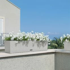 In dem dekorativen Pflanzkasten ‚Balconera Cottage 80‘ von Lechuza fühlen sich Ihre Balkon- oder Zimmerpflanzen wohl. Der smarte Blumenkasten verfügt über ein integriertes Bewässerungssystem für optimale Wasserversorgung. Die angesagte Flechtoptik verleiht dem Balkonkasten in Lichtgrau einen modernen Touch.