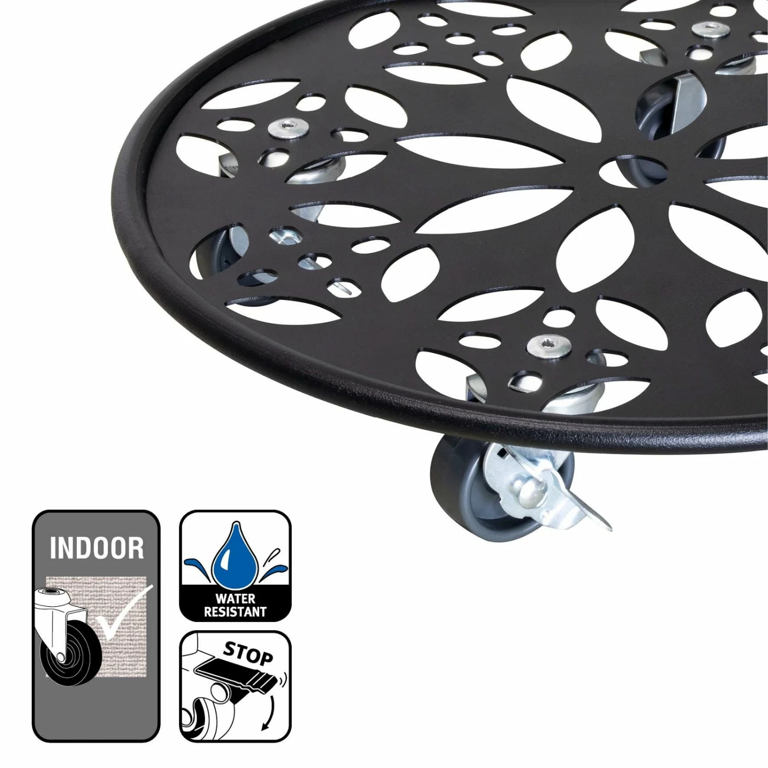Dieser Pflanzenroller mit einer Tragfläche aus massivem Stahlblech besticht durch seinen anspruchsvollen Designentwurf und hält Belastungen von bis zu 100 Kilogramm problemlos stand. Ein umlaufender Stahlrand verleiht dem Modell nicht nur ein Plus an Stabilität, sondern verhindert auch, dass die Pflanzgefäße unterwegs abrutschen.
