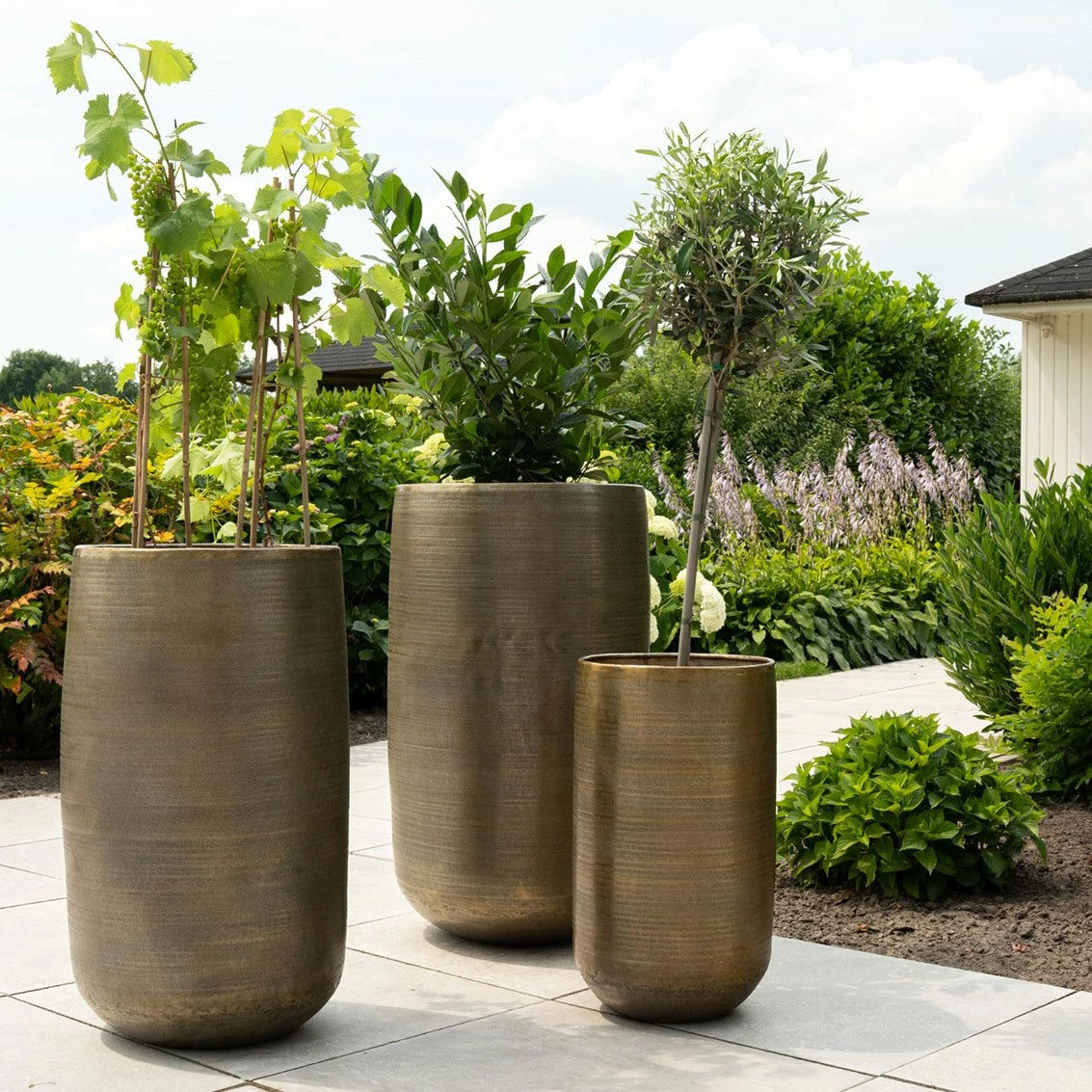 Das Pflanzgefäß ‚Rowen‘ besticht durch seine effektvolle schlanke Form und setzt dank der golden schimmernden Oberfläche glamouröse Akzente. Dieses Schmuckstück besteht aus hochwertig verarbeitetem Aluminium und fasziniert durch eine per Hand aufgetragene Oberflächenstruktur. Somit bekommen Sie mit jedem Pflanzgefäß ‚Rowen‘ ein Unikat in Designerqualität. Dabei sieht der Pflanztopf aus Alu nicht nur schick aus, sondern ist witterungsbeständig und rostfrei. Es ist problemlos möglich, dieses Gefäß ganzjährig draußen stehen zu lassen. Mit einem Fassungsvermögen von rund 43 Litern bietet das Pflanzgefäß ‚Rowen‘ genug Platz für die Wurzeln und harmoniert dank seiner schmalen Form sowohl mit überhängend als auch mit aufrecht wachsenden Zierpflanzen.