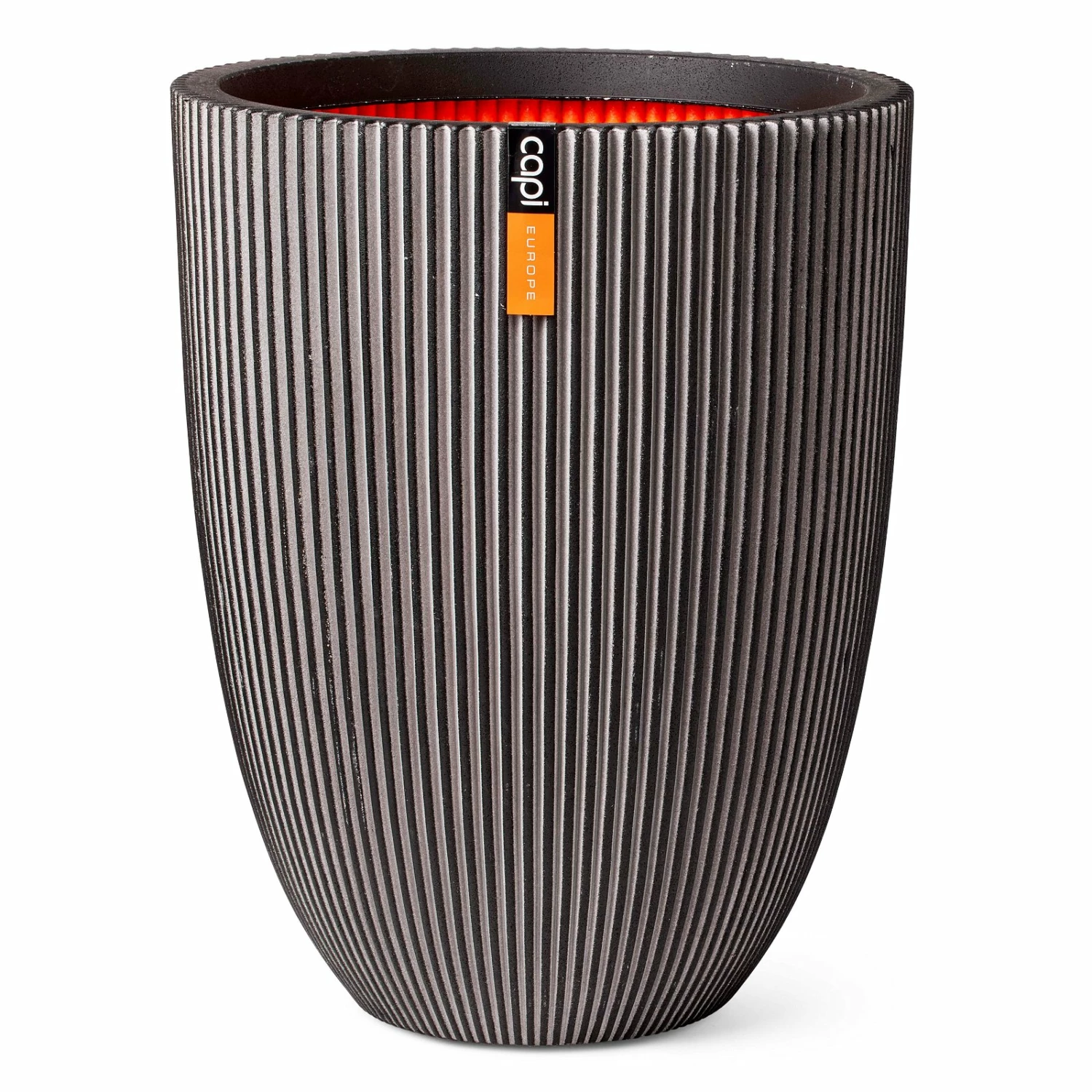Die Pflanzvase ‚Groove‘ von Capi Europe präsentiert sich in edlem Anthrazit und besteht aus bruchsicherem, frostfestem und UV-beständigem Kunststoff. Dabei überzeugt dieses Pflanzgefäß mit seinem trendigen, klarem Designentwurf und einer dekorativen Oberflächenstruktur. Um die Pflanzvase ‚Groove‘ dauerhaft draußen zu verwenden, bohren Sie ein Ablaufloch in den Boden.