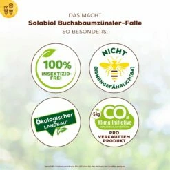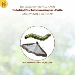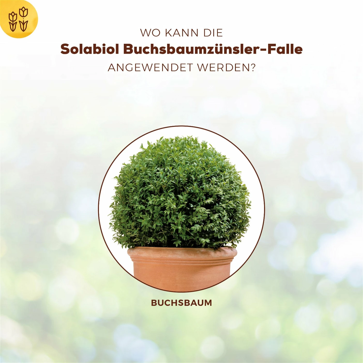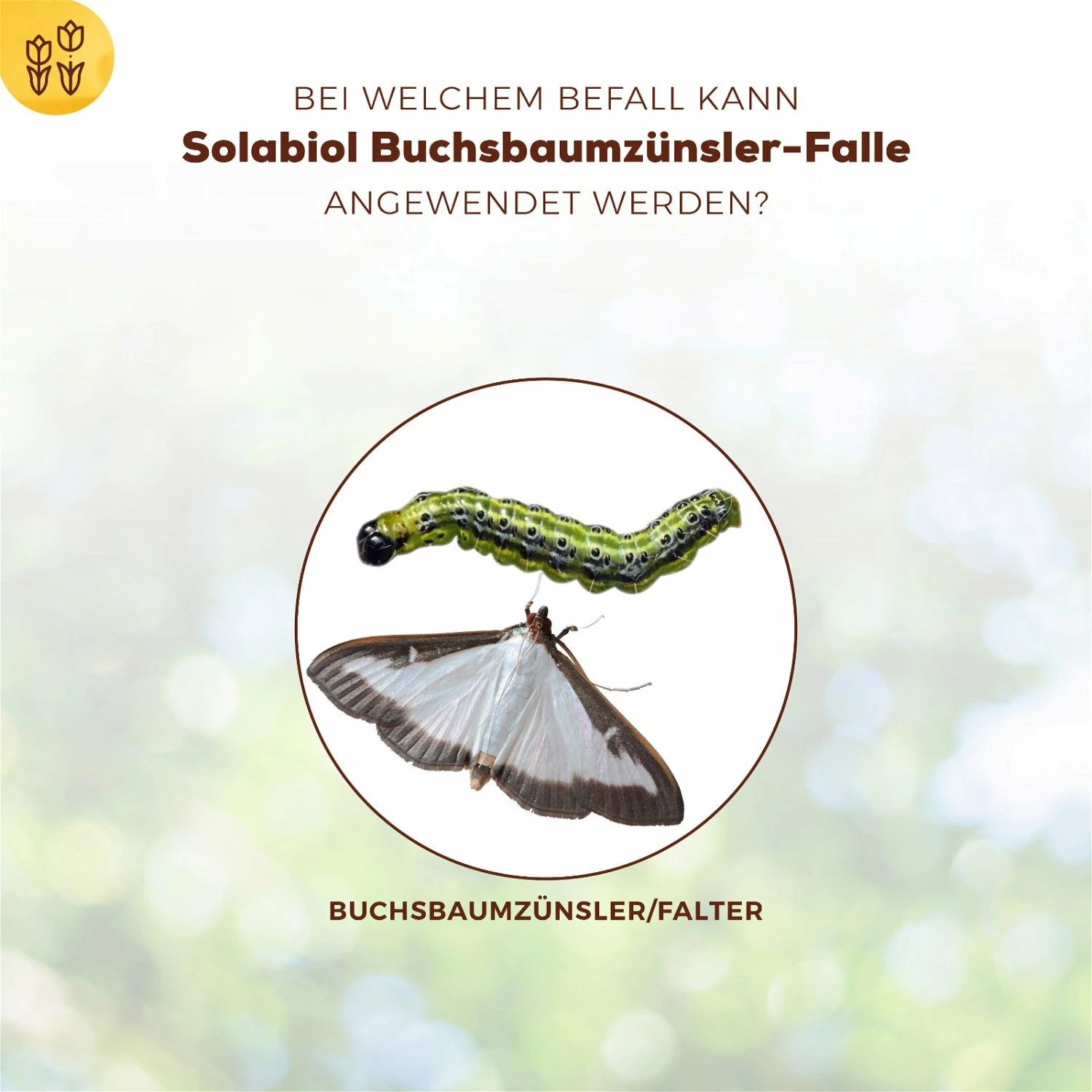 Die Buchsbaumzünsler-Falle dient der insektizidfreien Befallskontrolle des Buchsbaumzünslerfalters. Die Männchen werden durch Pheromone, welche in Gelform in die Falle eingefüllt werden, angelockt und fallen in den präparierten Behälter. Dadurch wird der richtige Behandlungszeitpunkt für ein Insektizid, wie Schädlingsfrei Lizetan® AZ oder Universal-Raupenfrei Lizetan® angezeigt. Durch die Behandlung zum richtigen Zeitpunkt kommt es zu keinen Schäden an den Pflanzen. Im Nebeneffekt wird die Befruchtung der Weibchen und somit die Fortpflanzung vermindert. Die robuste Zünslerfalle ist sehr witterungsbeständig und stabil, wodurch sie mehrere Jahre verwendet werden kann.