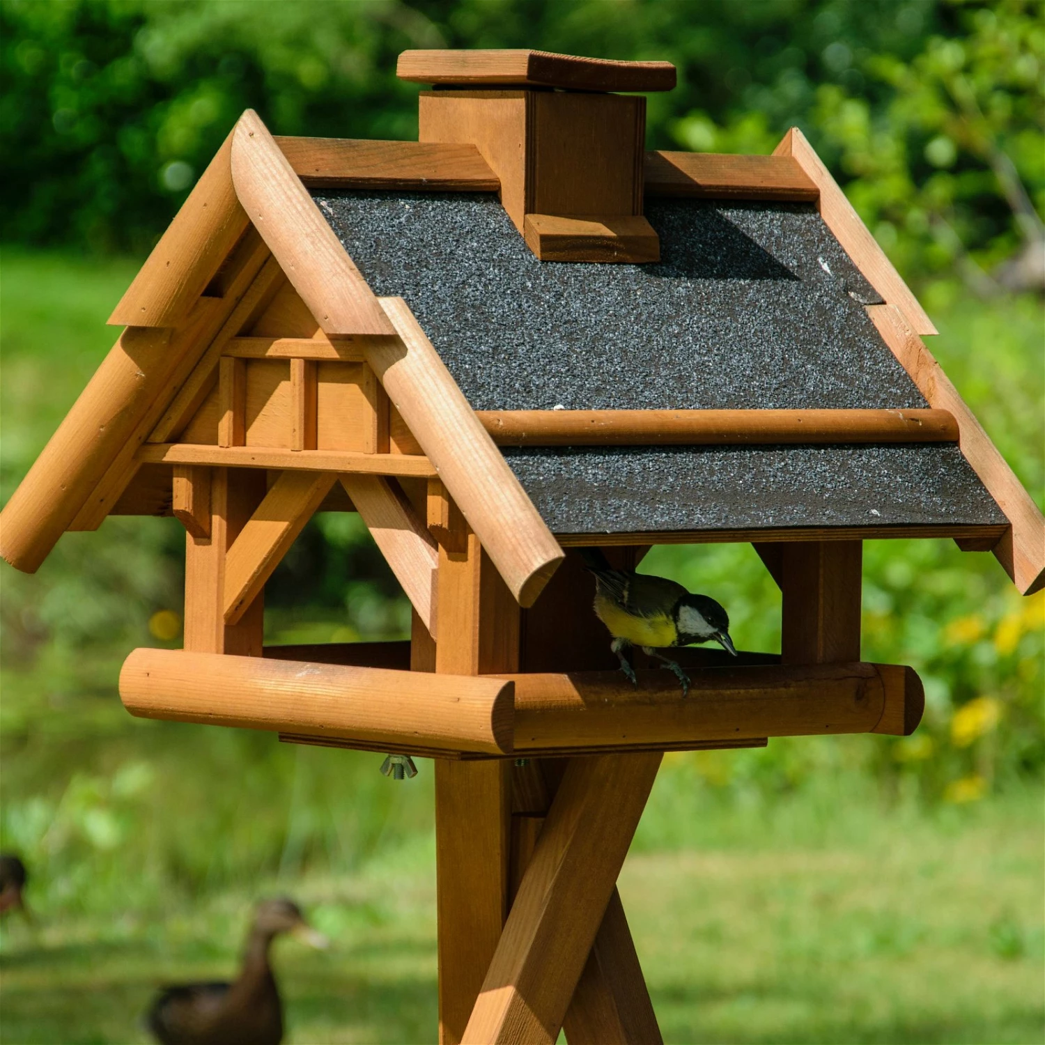 Laden Sie Wildvögel in Ihren naturfreundlichen Garten ein und retten Sie die gefiederten Freunde vor dem Hungertod! Dieses liebevoll gestaltete und sorgfältig verarbeitete Vogelfutterhaus mit einem stabilen Ständer lässt sich ganz unkompliziert durch den Kamin mit Sämereien befüllen und wertet Ihr Gartenkonzept durch ein sympathisches Highlight auf. Denken Sie daran, das Vogelfutterhaus an einem wind- und sonnengeschützten Standort aufzustellen.
