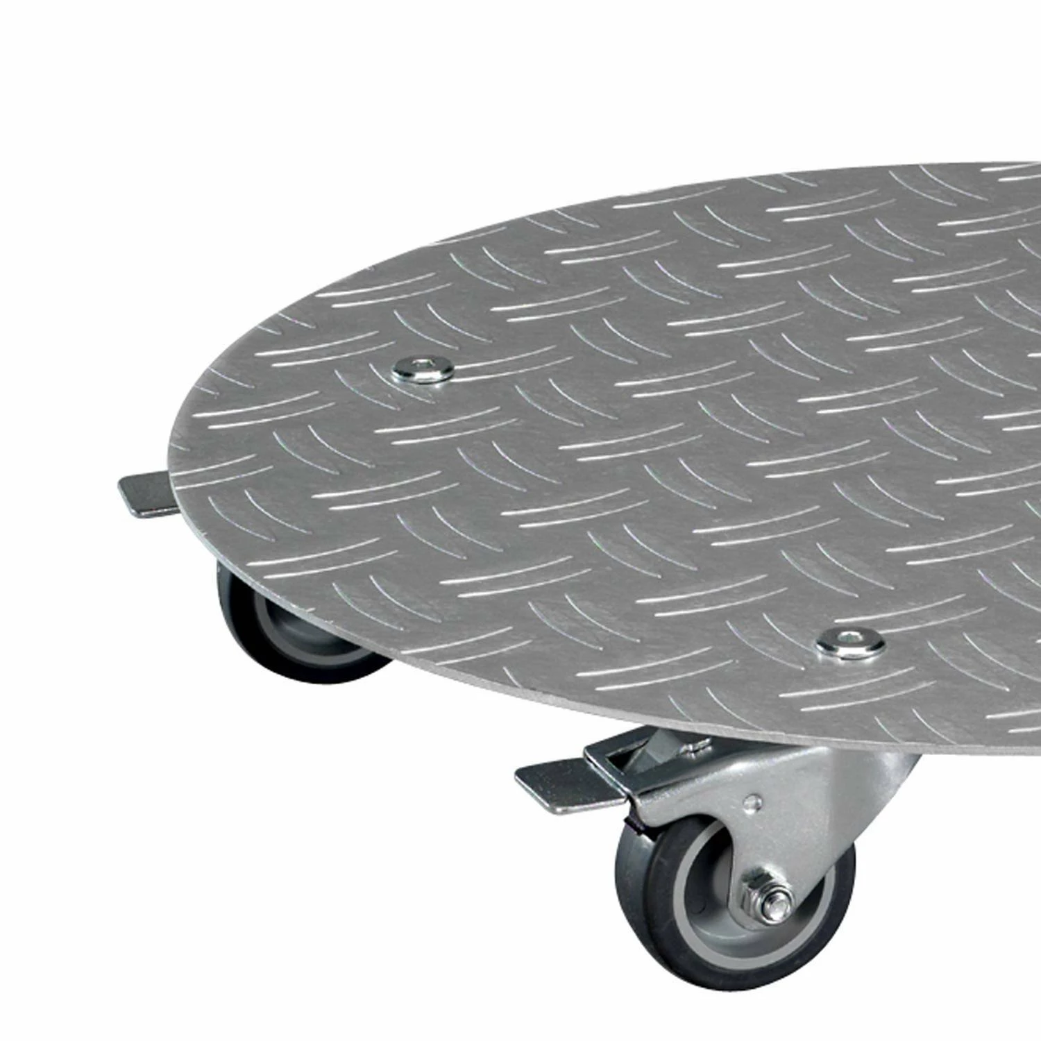 Dieser wasserabweisende Pflanzenroller besteht aus grauem Alu Riffelblech und hat einen Durchmesser von etwa 38 cm. Durch die geriffelte Oberfläche verrutschen die Pflanzgefäße beim Bewegen nicht und können sicher transportiert werden. Vier Rollen, von denen zwei mit starken Feststellbremsen ausgestattet sind, sorgen für einen guten Lauf auf beinahe allen Bodenbelägen.